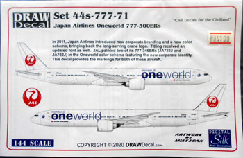 2020.12.16(水) 13:54 【新製品】Drawデカール 44-777-71 1/144 日本航空 Oneworld 777-300ERs 4,190円 ●Drawデカール 44-777-71 1/144 日本航空 Oneworld 777-300ERs 4,190円(税込み)