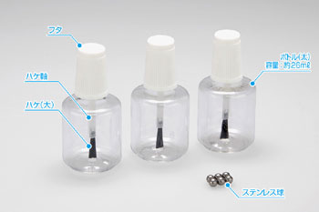 - 材料の粘度にあわせてステンレス球を入れ、使用前にボトルを振って中の材料をかくはんすることができます。